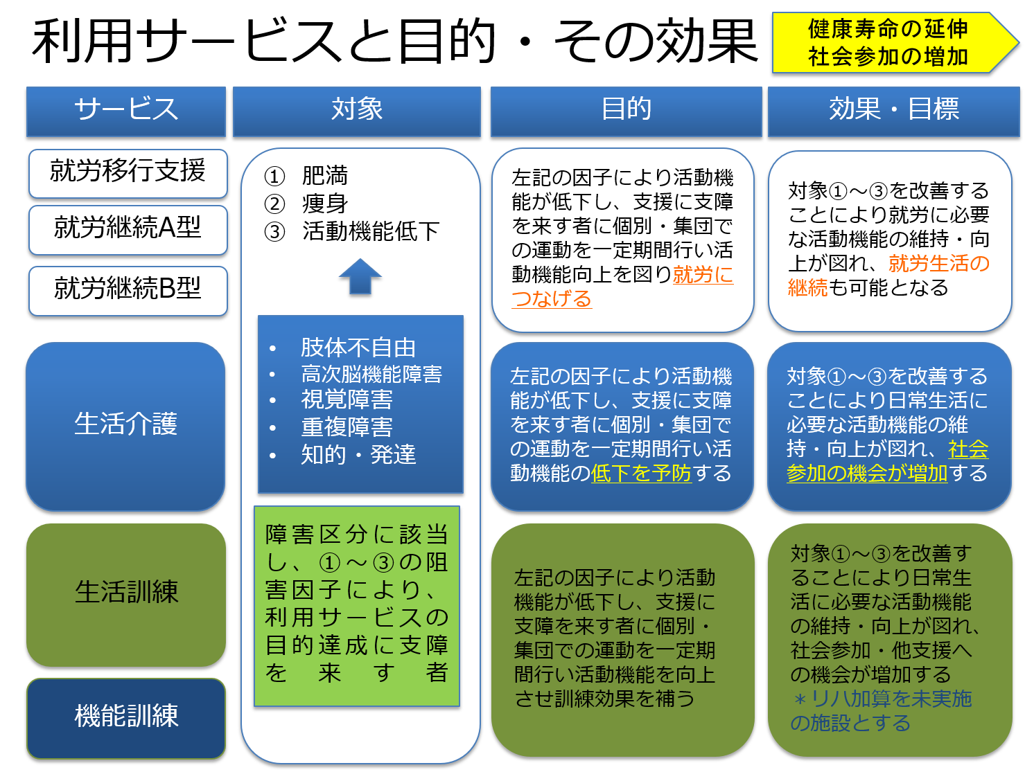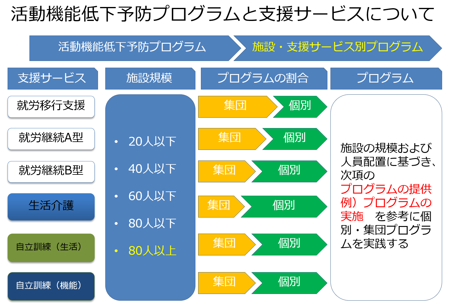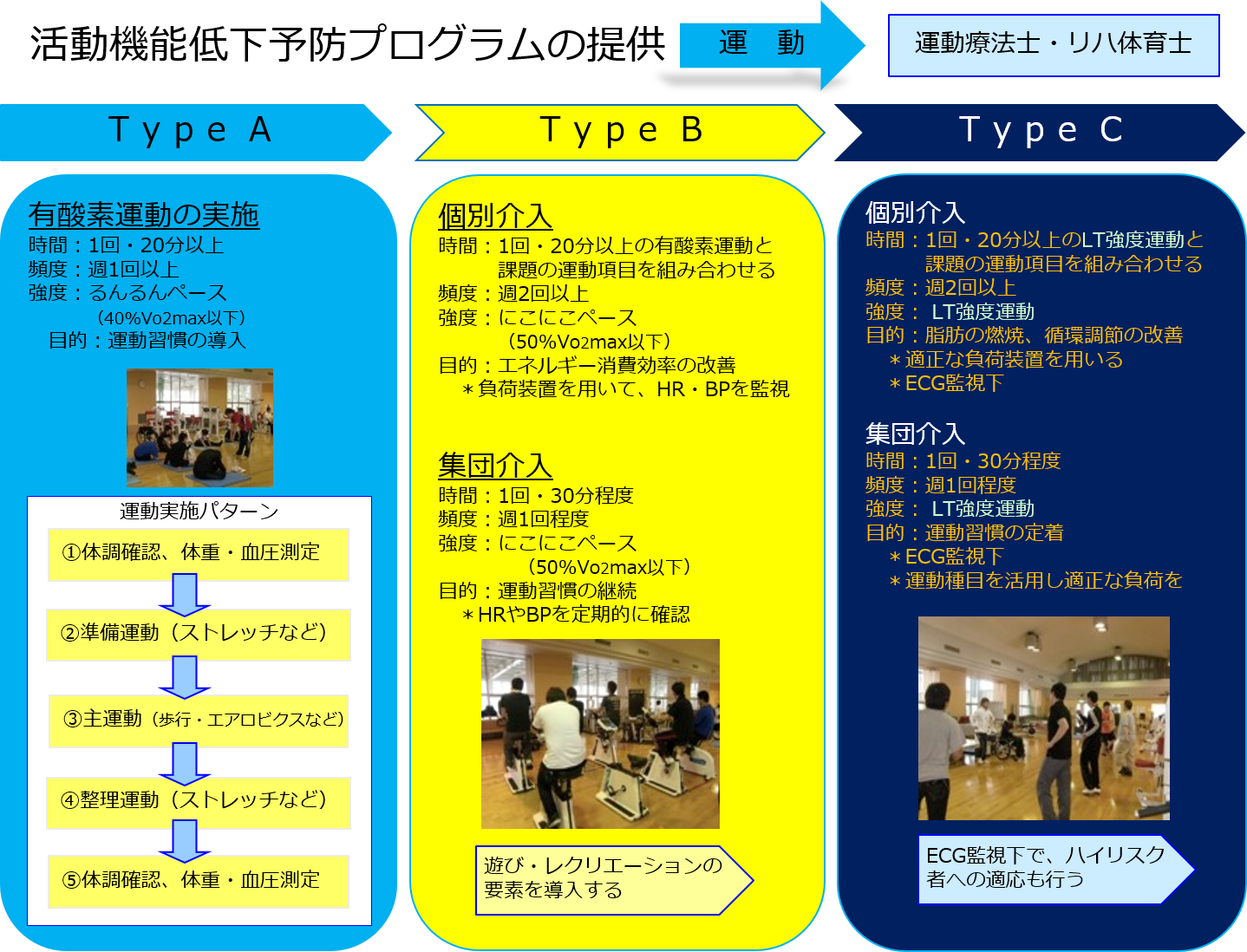 施設で健康増進に取り組む場合、どこから始めようかと戸惑うことがあります。実際には施設ごとに様々な特徴や事情があり、画一的な方法を提示することは難しいのが実情です。ここでは健康増進に関わることのできるスタッフや機材の状態に応じてA,B,Cの三段階に分けて取り組みを考える際のアウトラインを紹介します。